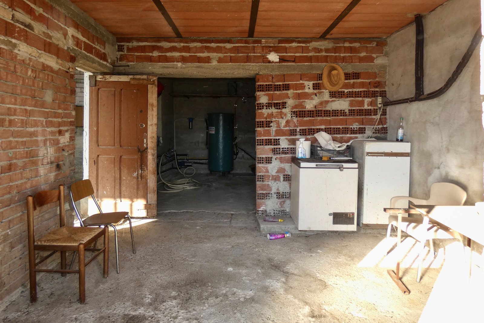 Additional external spaces include a cellar, boiler room, storage room, and a covered structure, all accessible from outside, reflecting the traditional layout of rural properties and offering practical support areas for daily life or future development.