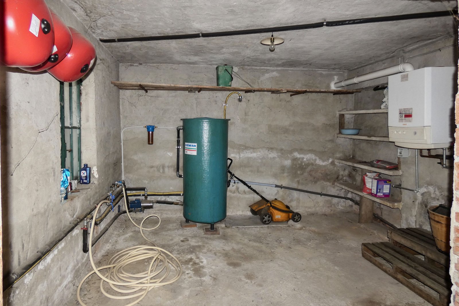 Multiple external service rooms including cellar and storage areas