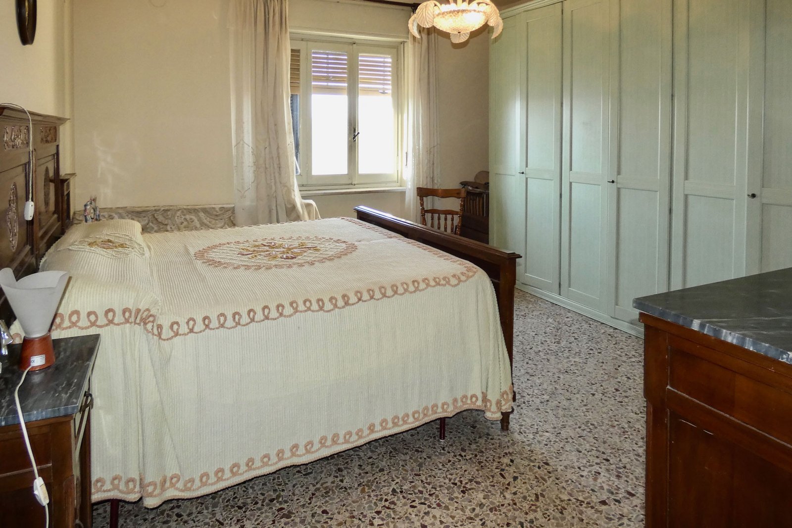 A large storage room adds practicality, while two wood-burning stoves contribute to the traditional charm and provide efficient heating during colder months. The layout reflects the authentic character of rural Piedmont homes, with generous and functional spaces.