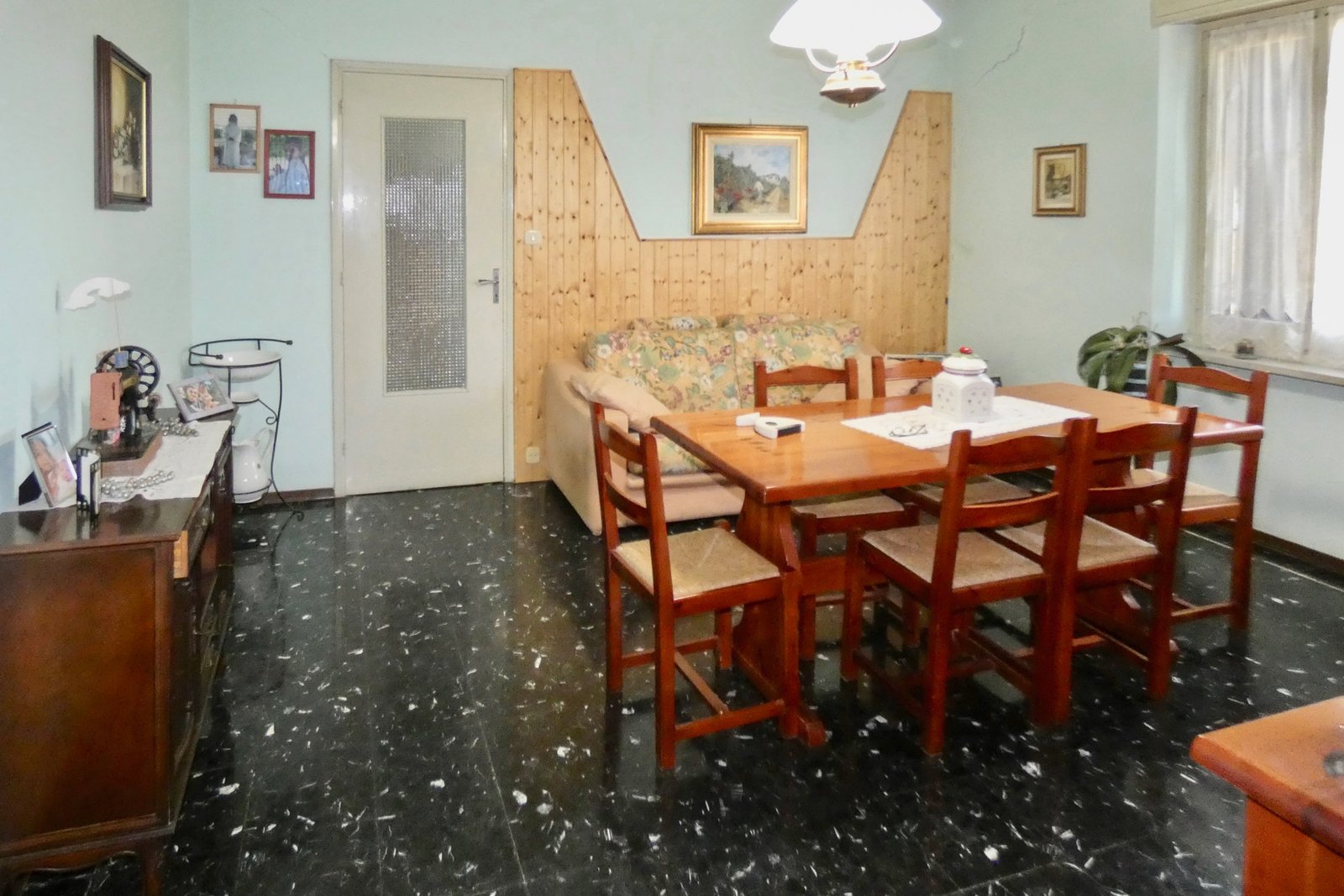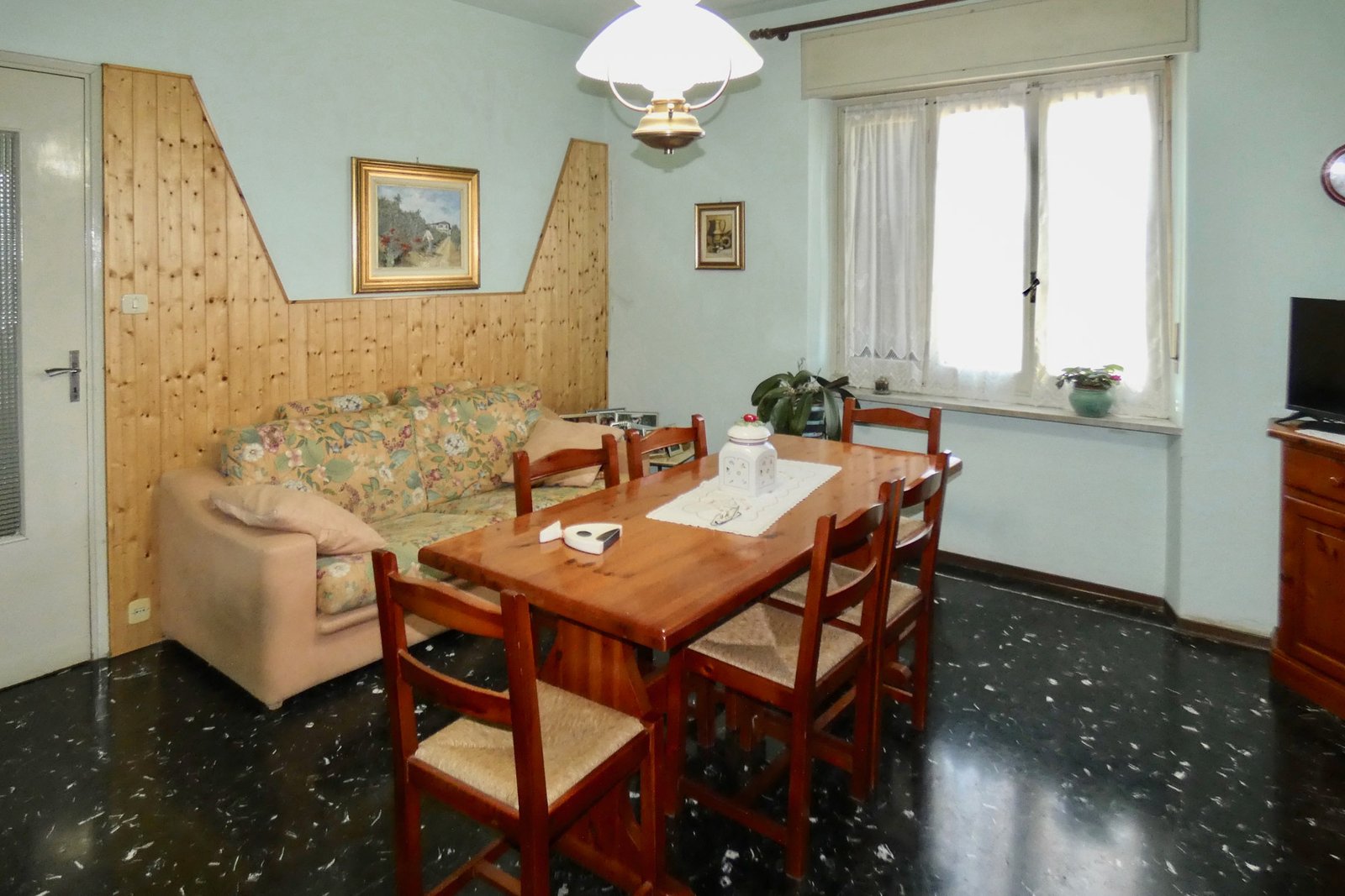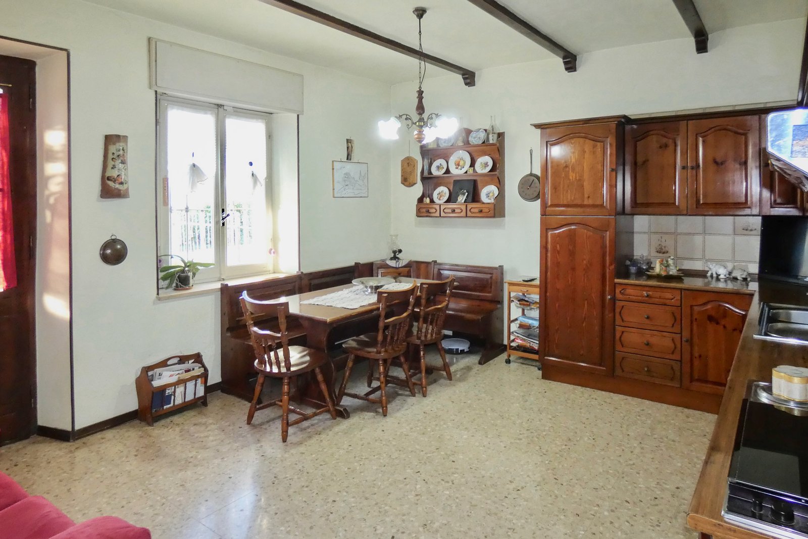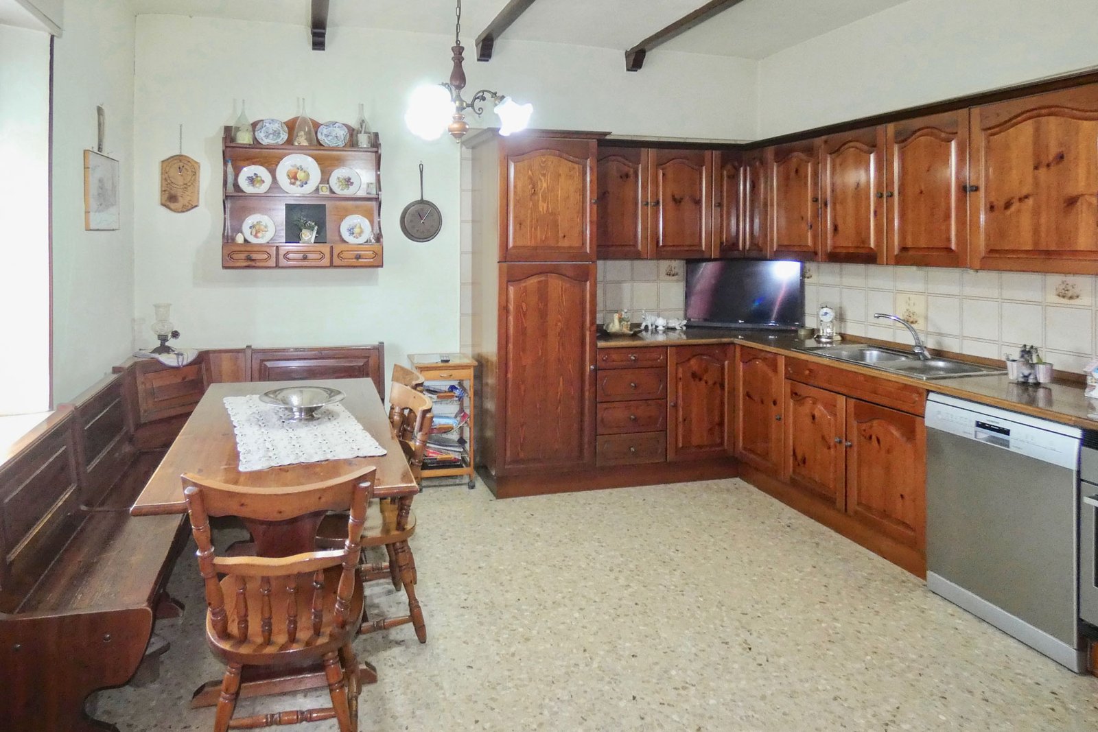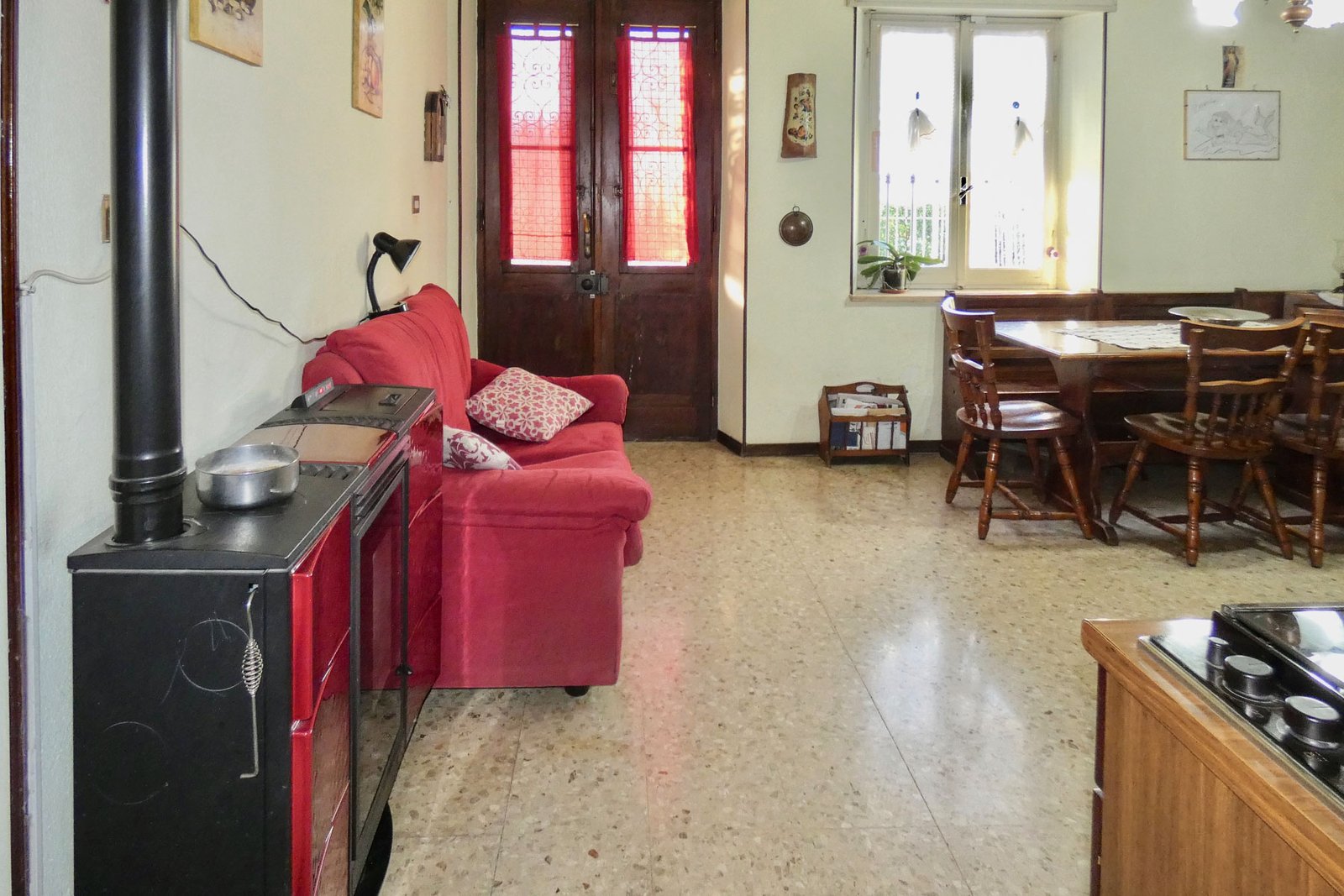 The ground floor of the main house features a welcoming living room, creating a warm and inviting atmosphere. The spacious kitchen is separate and fully habitable, ideal for daily life and entertaining.