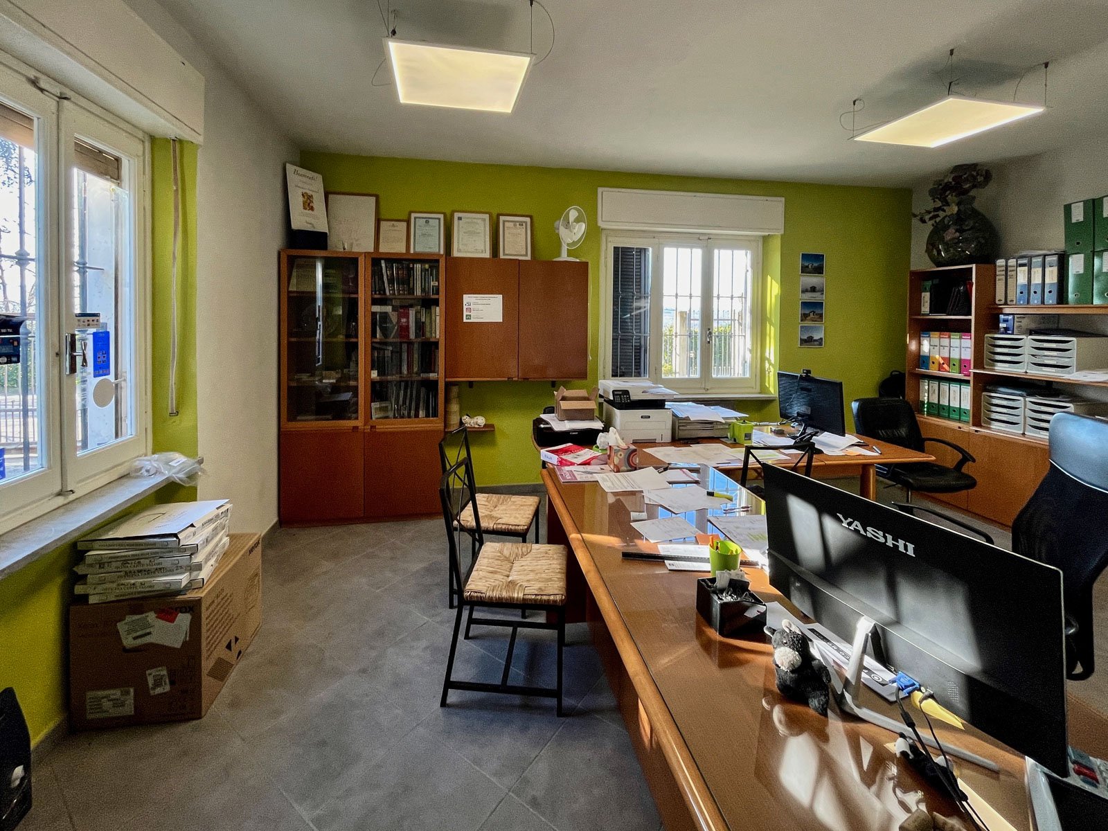 The property also includes a garage, covered parking spaces, and a small external office equipped with air conditioning, positioned conveniently near the warehouse entrance. This element is particularly valuable for those looking to manage a business directly on site.