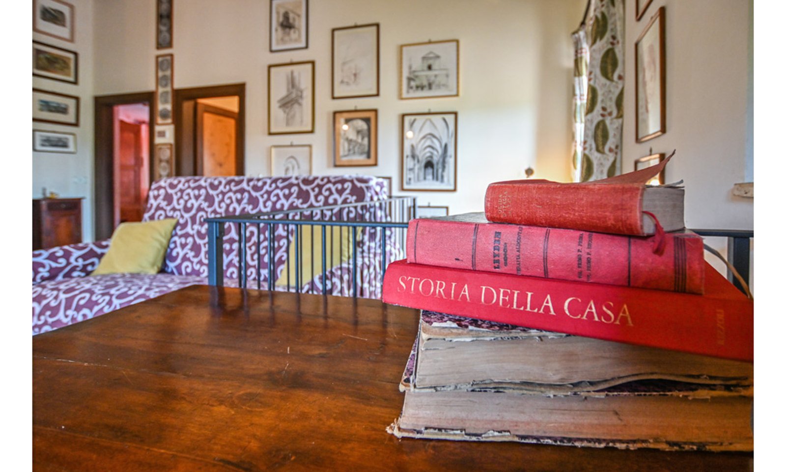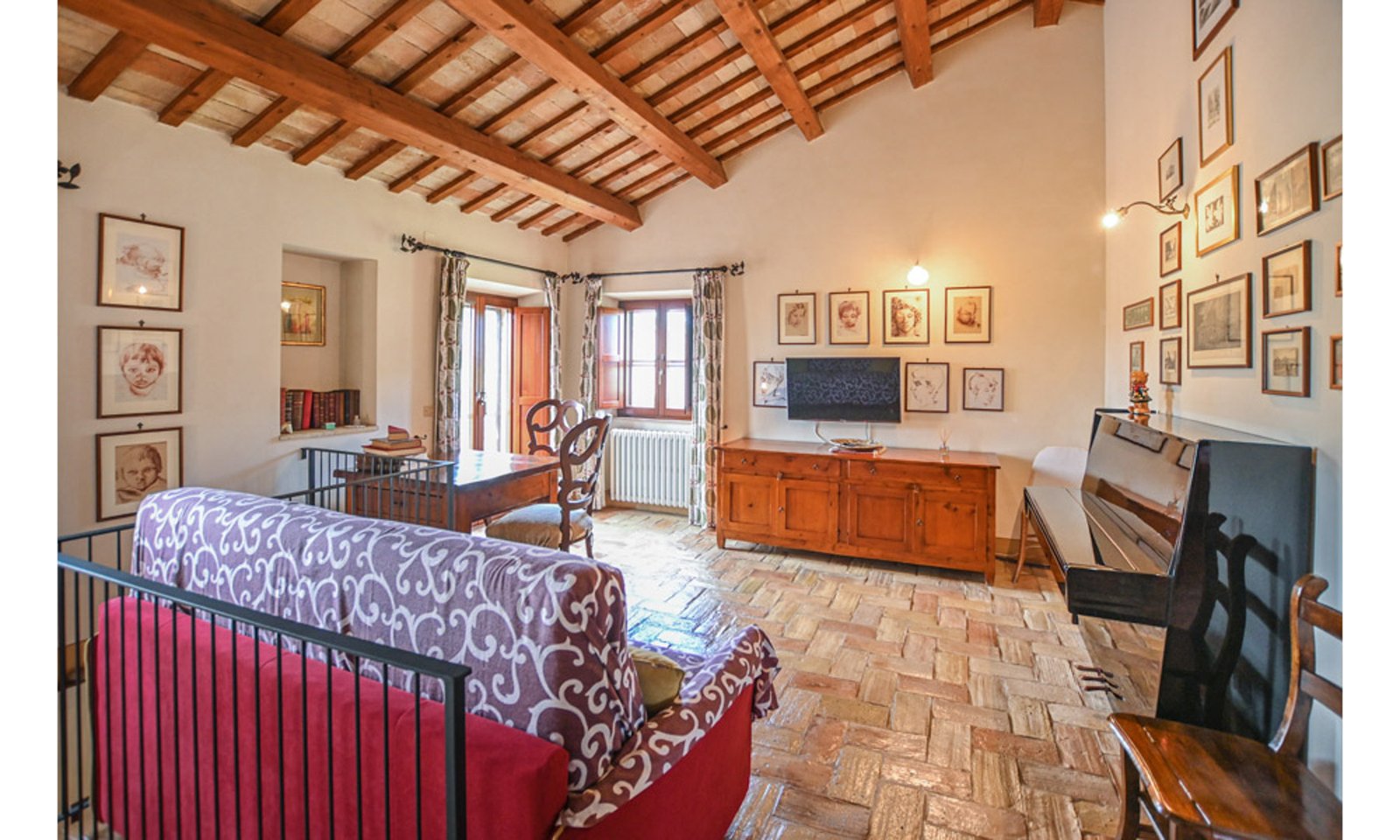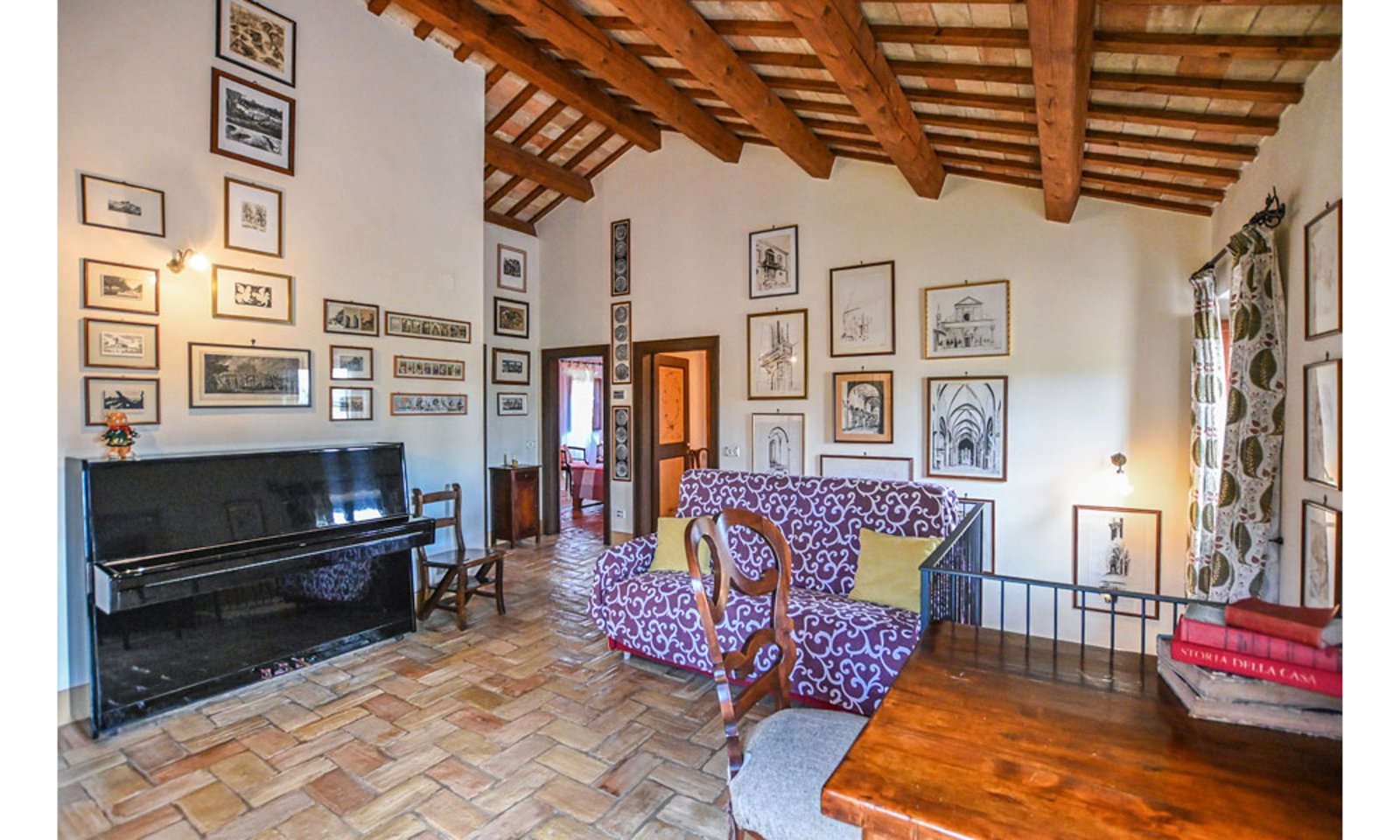 The upper level of the main apartment features a secondary living area that doubles as a study or reading lounge. From here, French doors lead to a panoramic terrace offering breathtaking views over the countryside and the Sibillini Mountains.