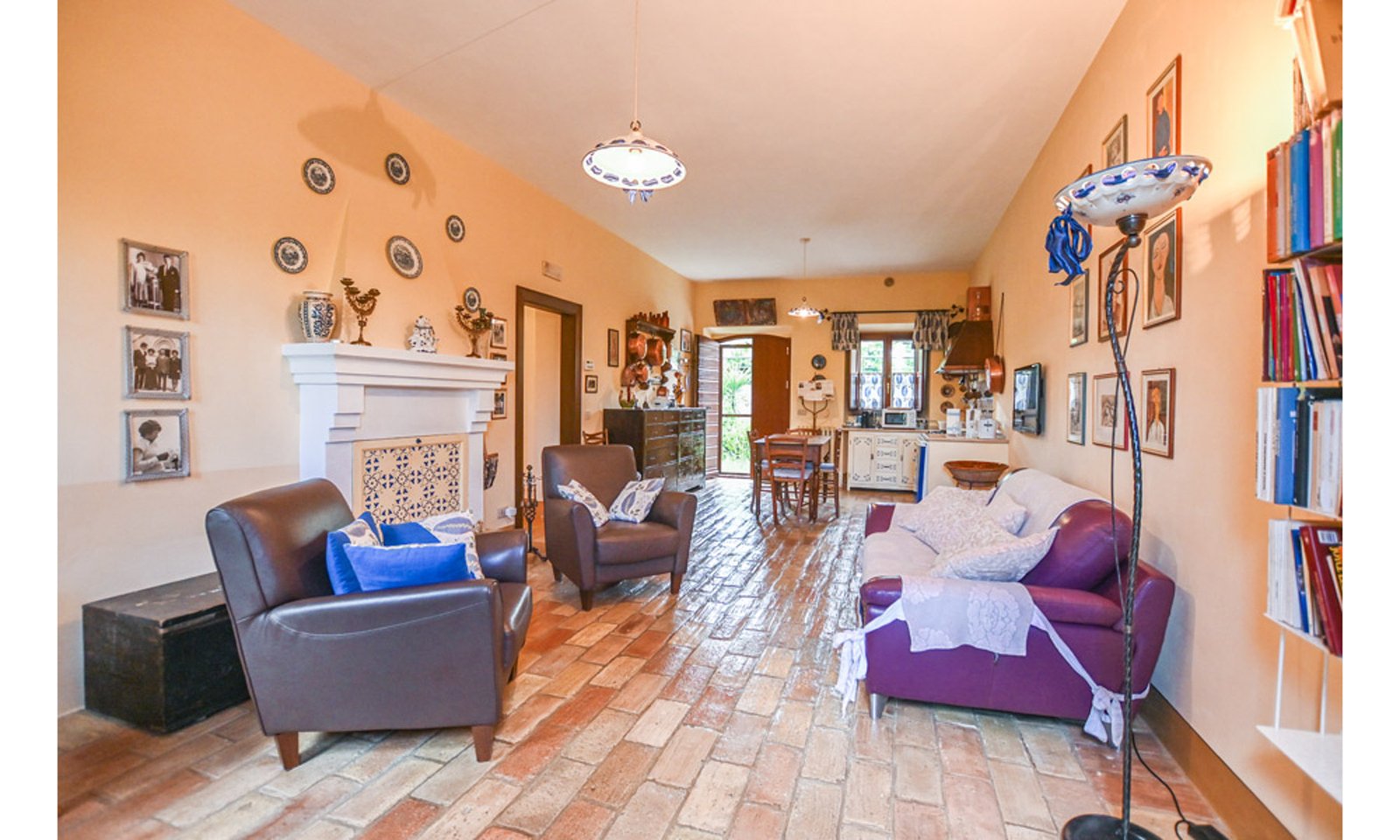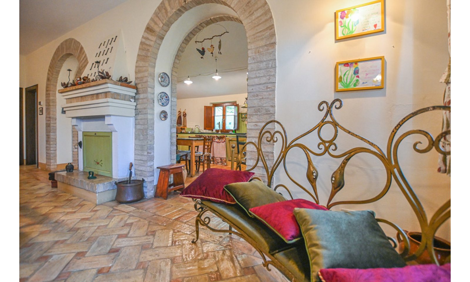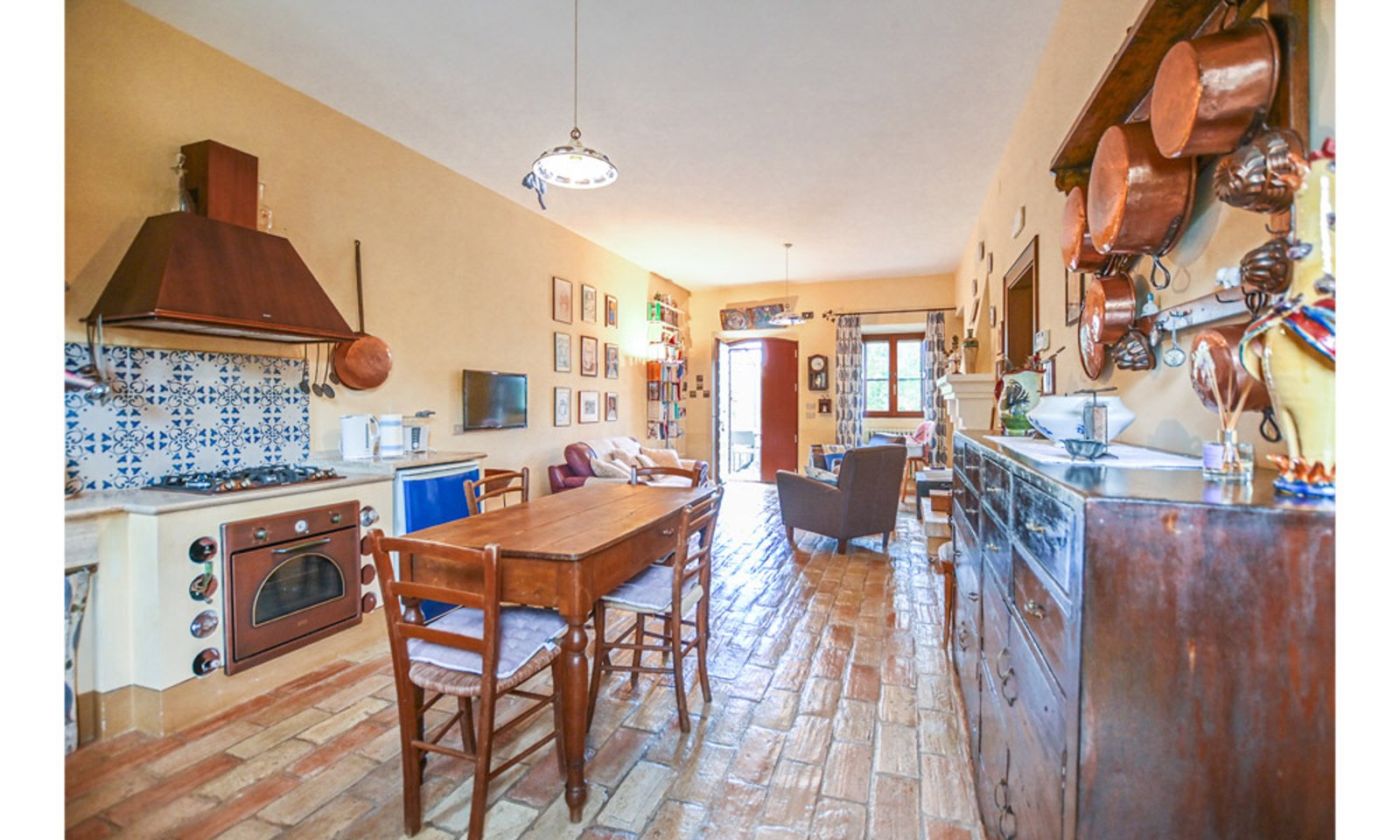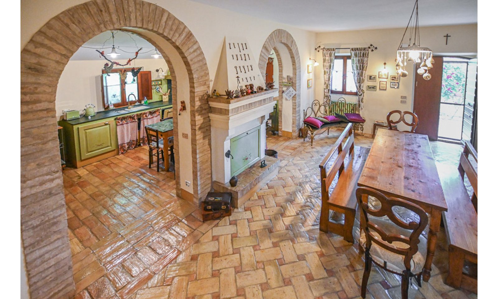 Every detail reflects careful craftsmanship and deep respect for the building’s history. The interiors are bright, airy, and welcoming, with exposed wooden beams, terracotta floors, and original ceiling tiles. The restoration preserves the farmhouse’s soul while incorporating modern systems and comfort, including new photovoltaic panels to enhance energy efficiency.