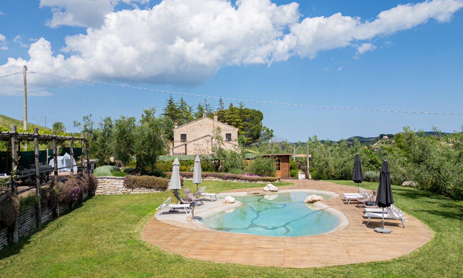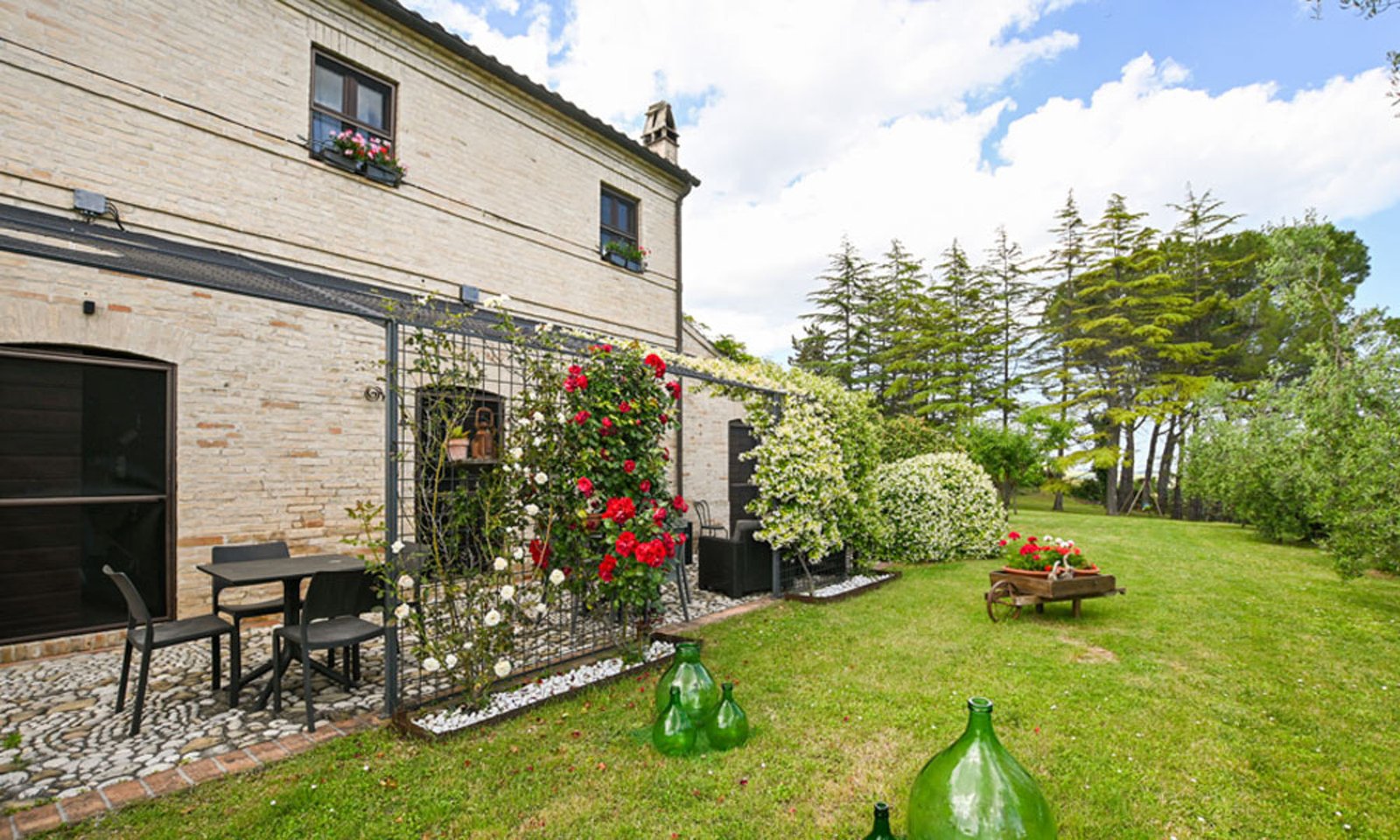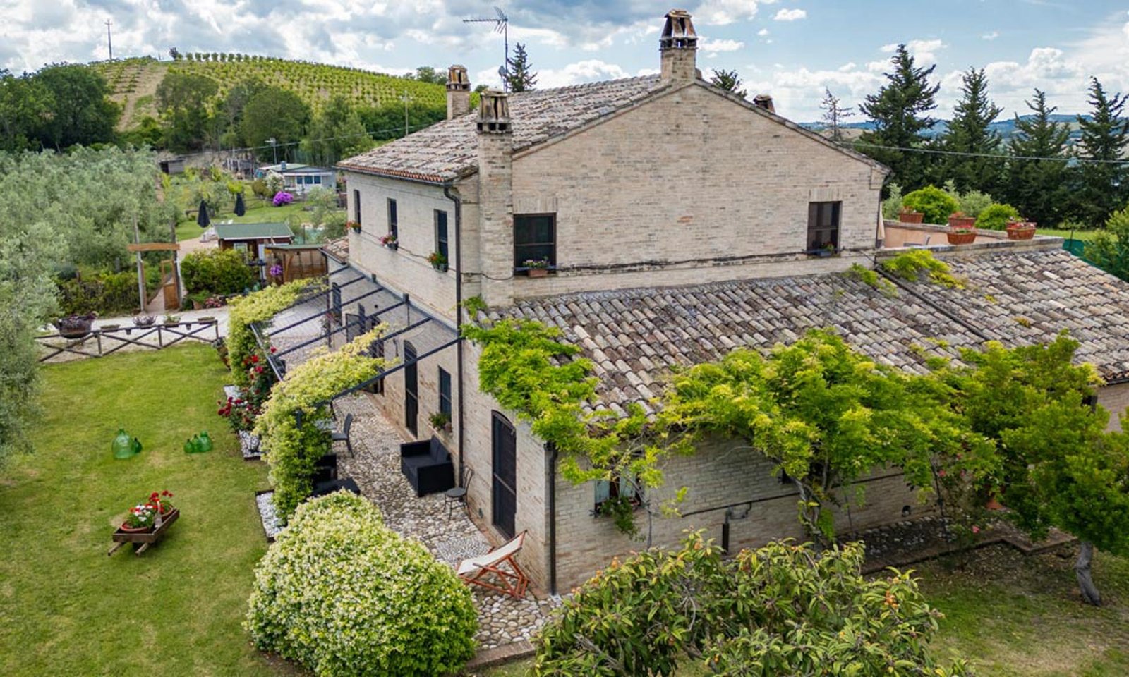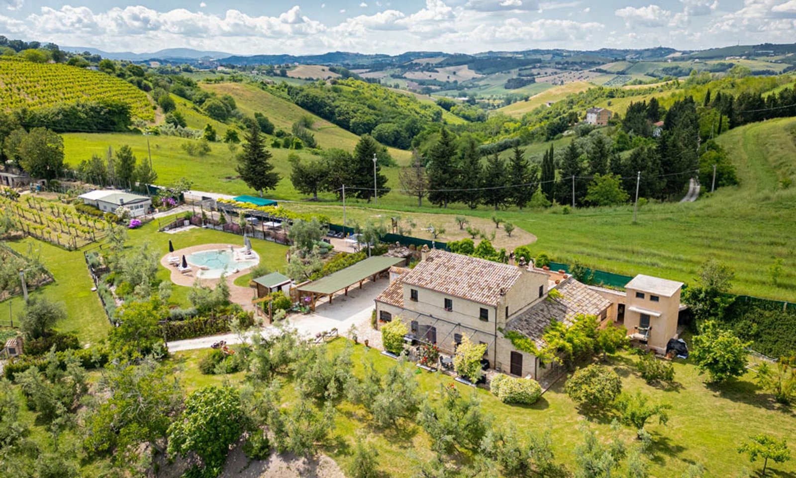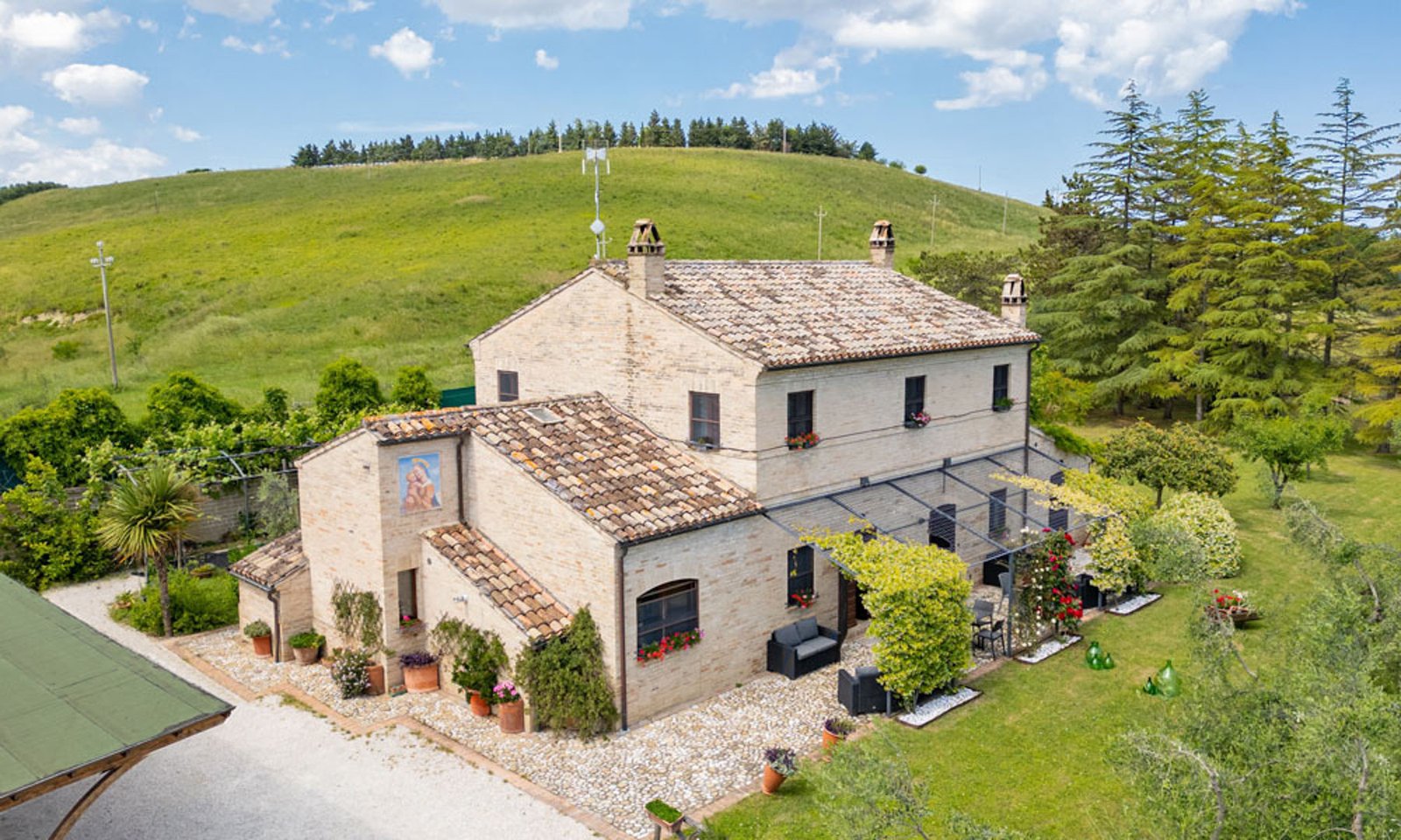 The surrounding landscape embodies the essence of Le Marche’s countryside — rolling fields, olive groves, and vineyards that change with the seasons, with the Sibillini Mountains visible in the distance. Despite its quiet rural setting, the estate remains conveniently close to the Adriatic coastline, where golden beaches and renowned seaside towns such as Porto San Giorgio, Pedaso, and Cupra Marittima can be reached in under 20 minutes.