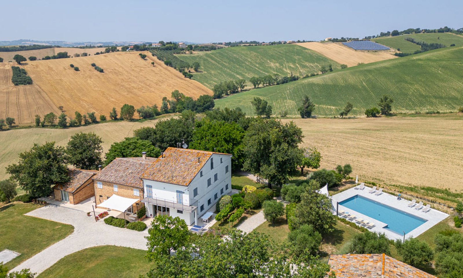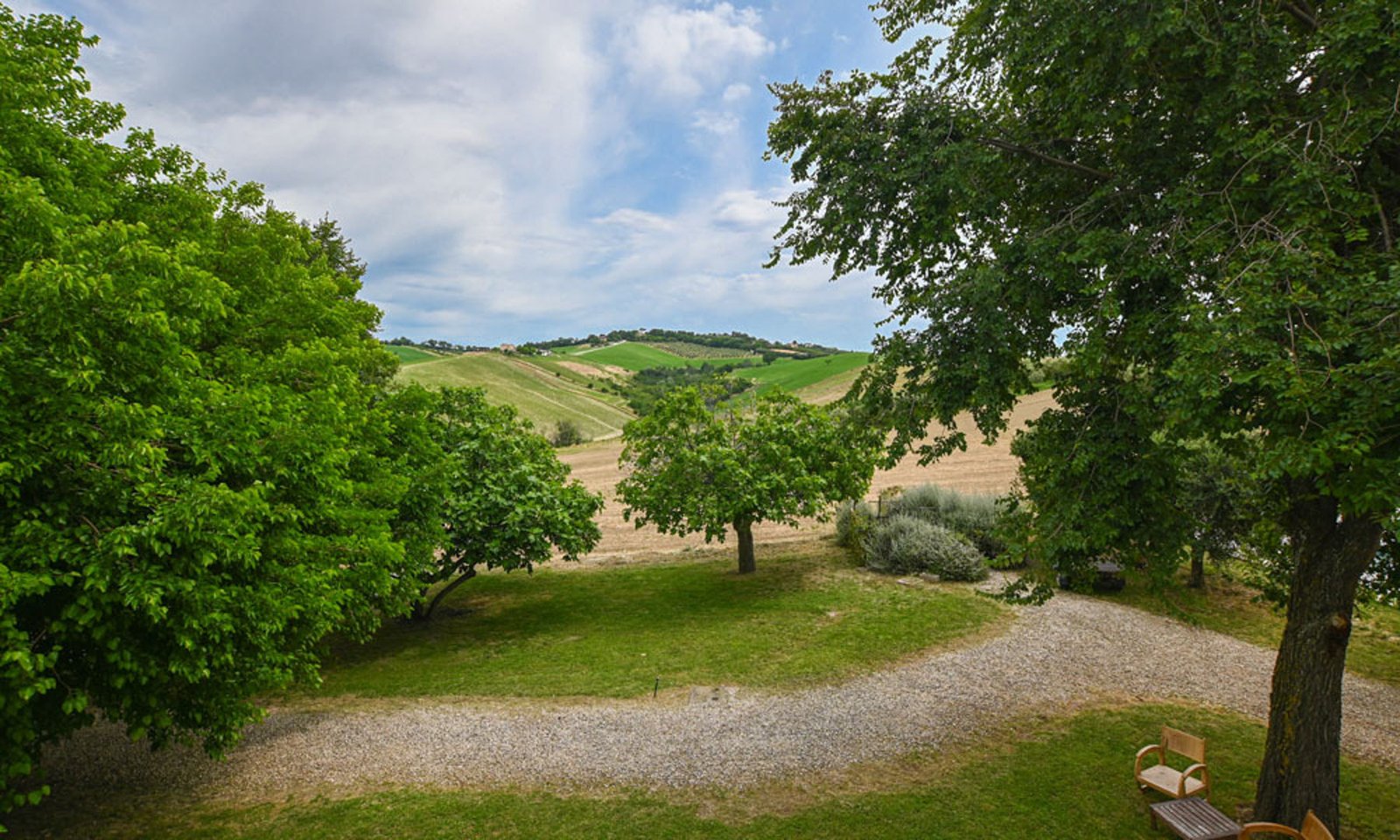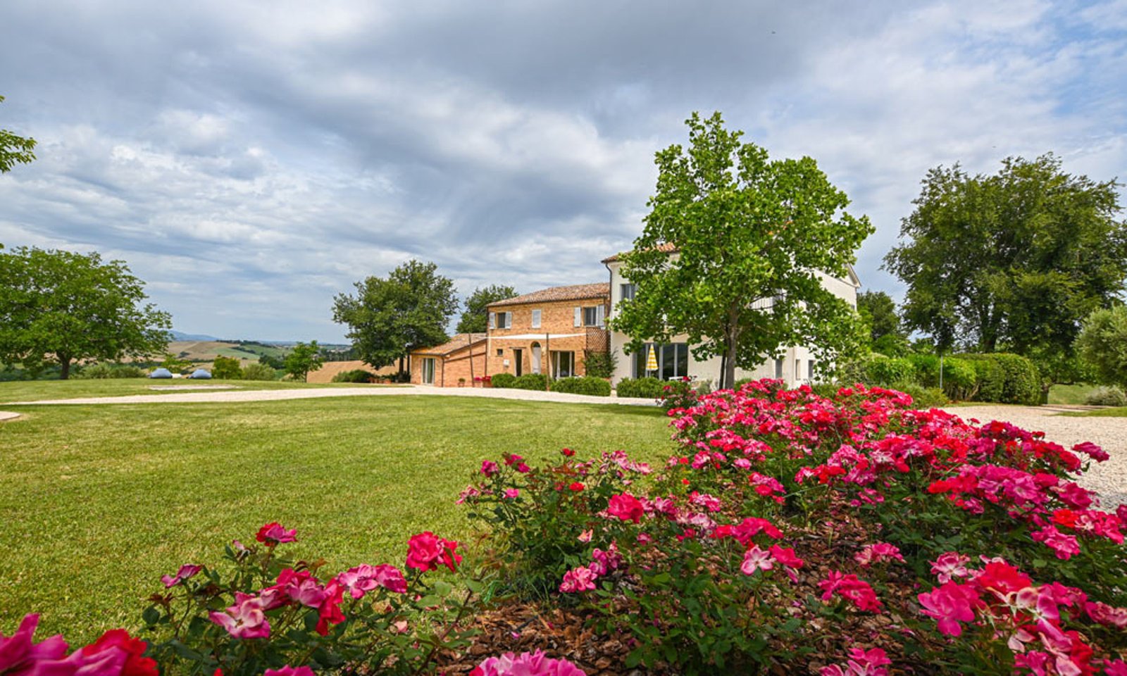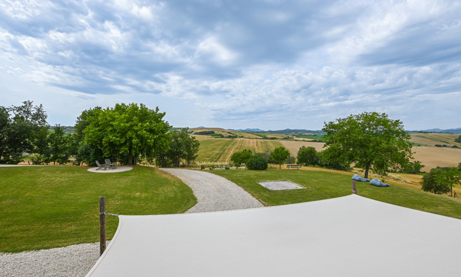 From every corner — whether lounging by the pool, sitting under the portico, or strolling through the garden — you can enjoy open views of the Marche countryside in all its seasonal beauty.