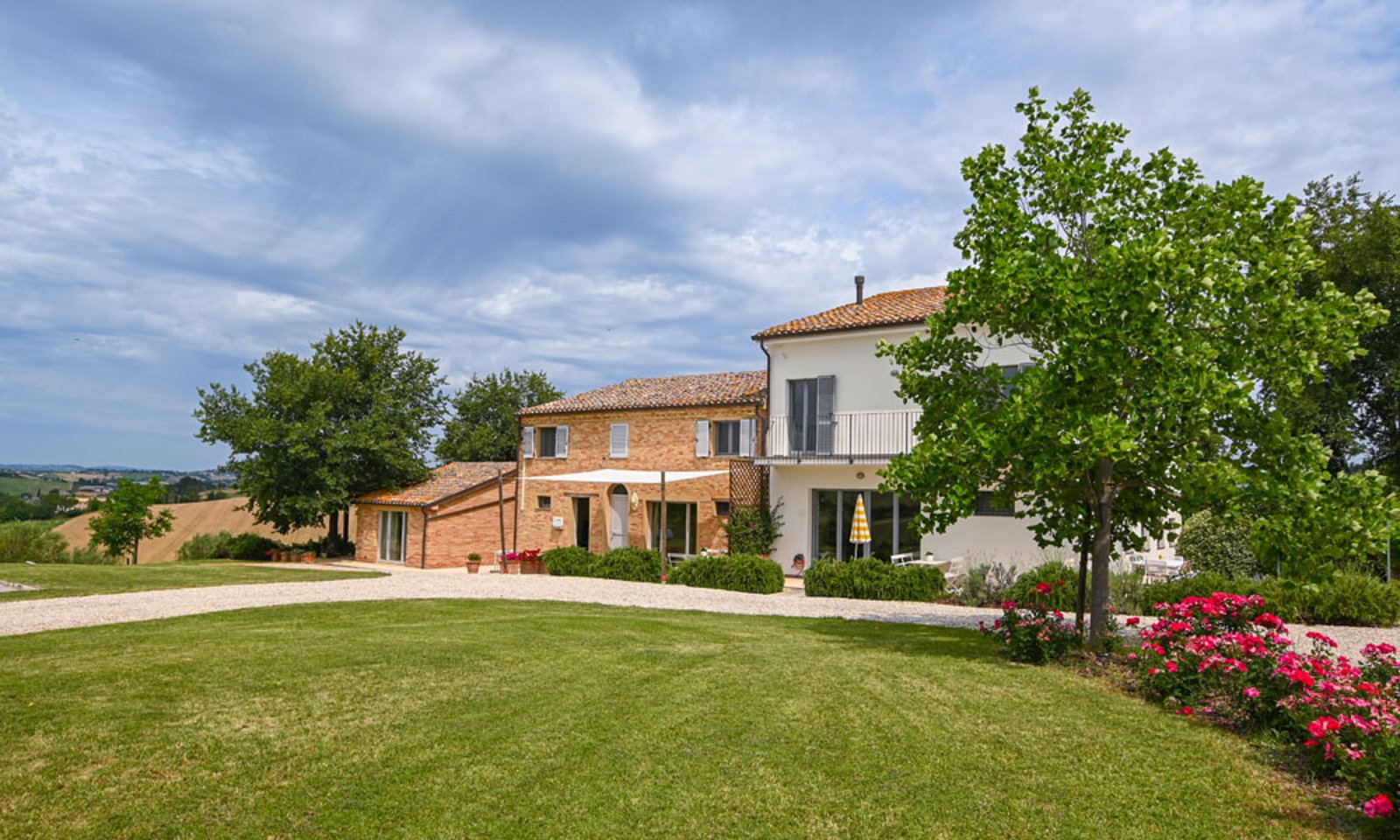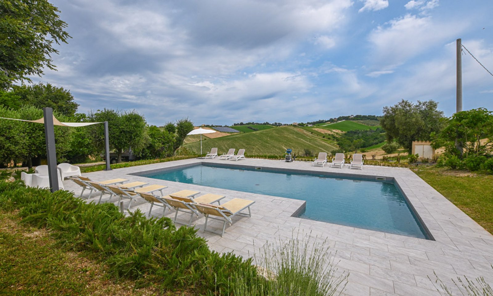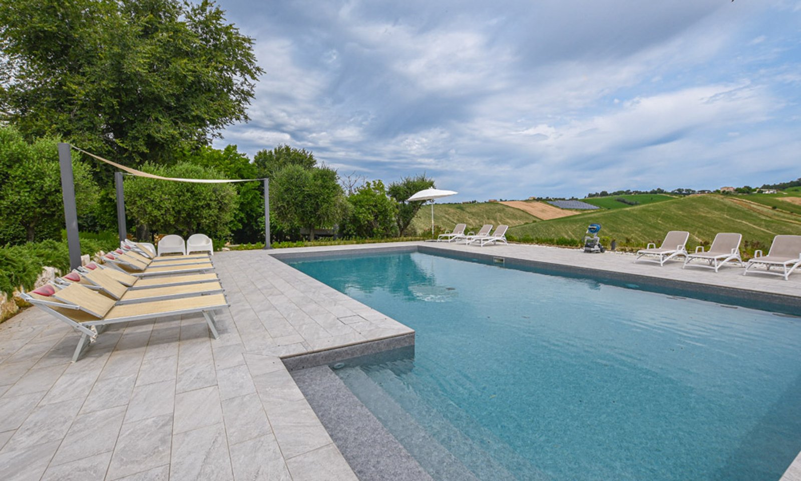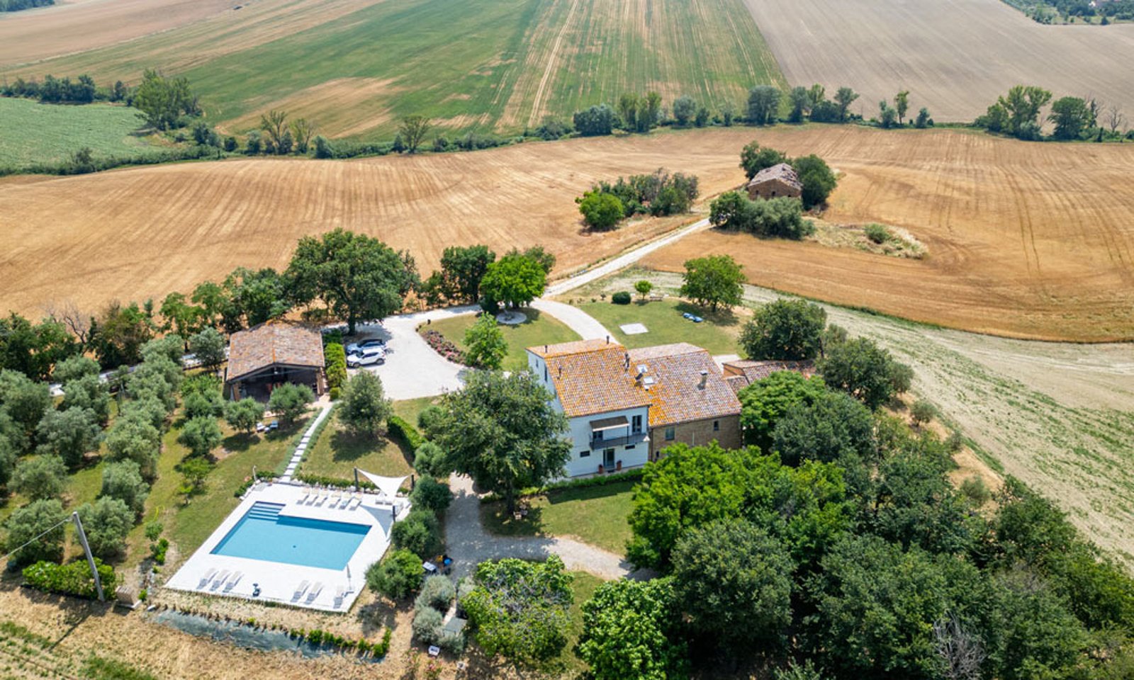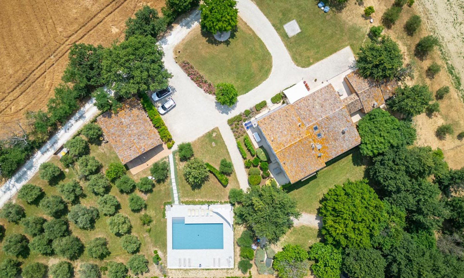 From every corner — whether lounging by the pool, sitting under the portico, or strolling through the garden — you can enjoy open views of the Marche countryside in all its seasonal beauty.