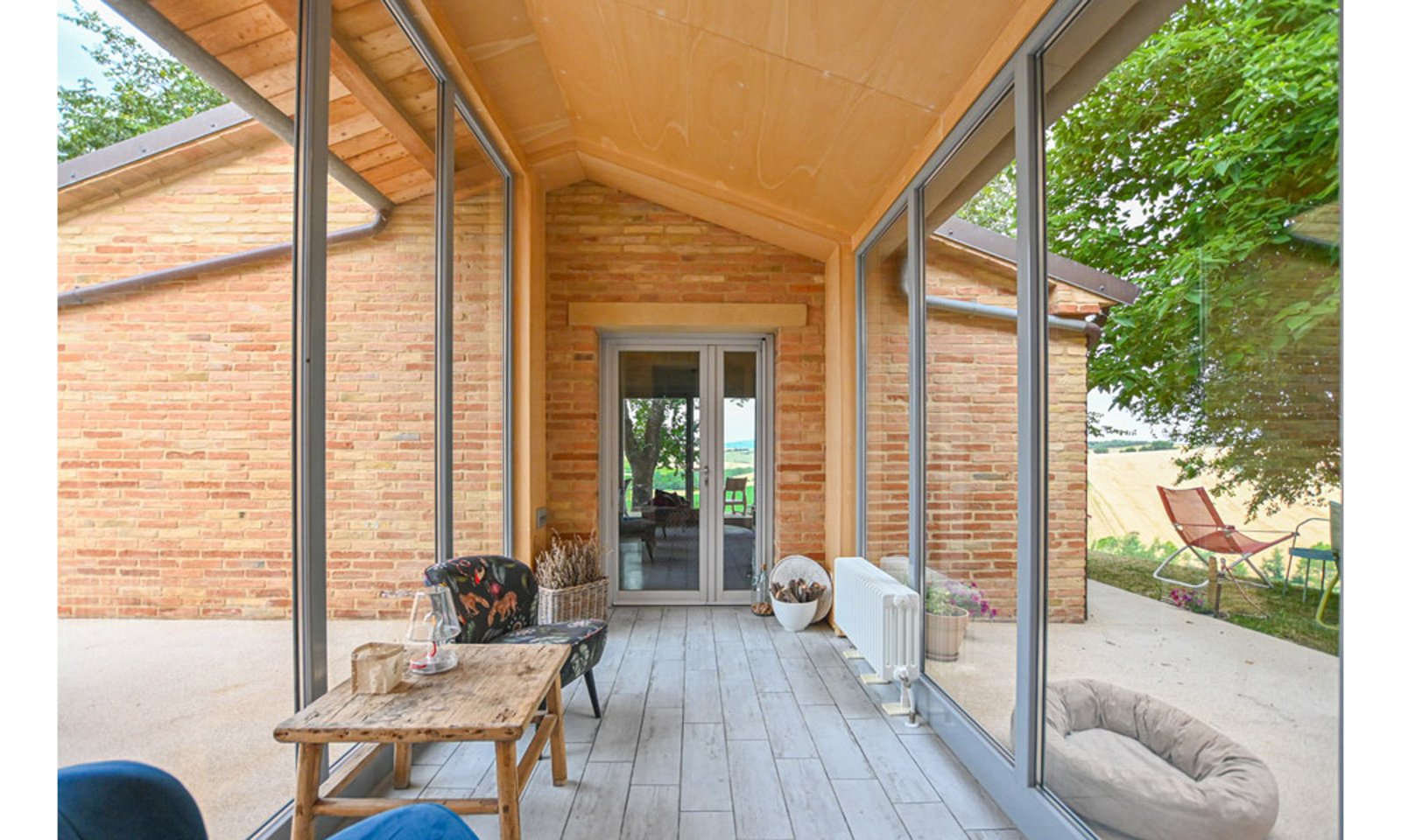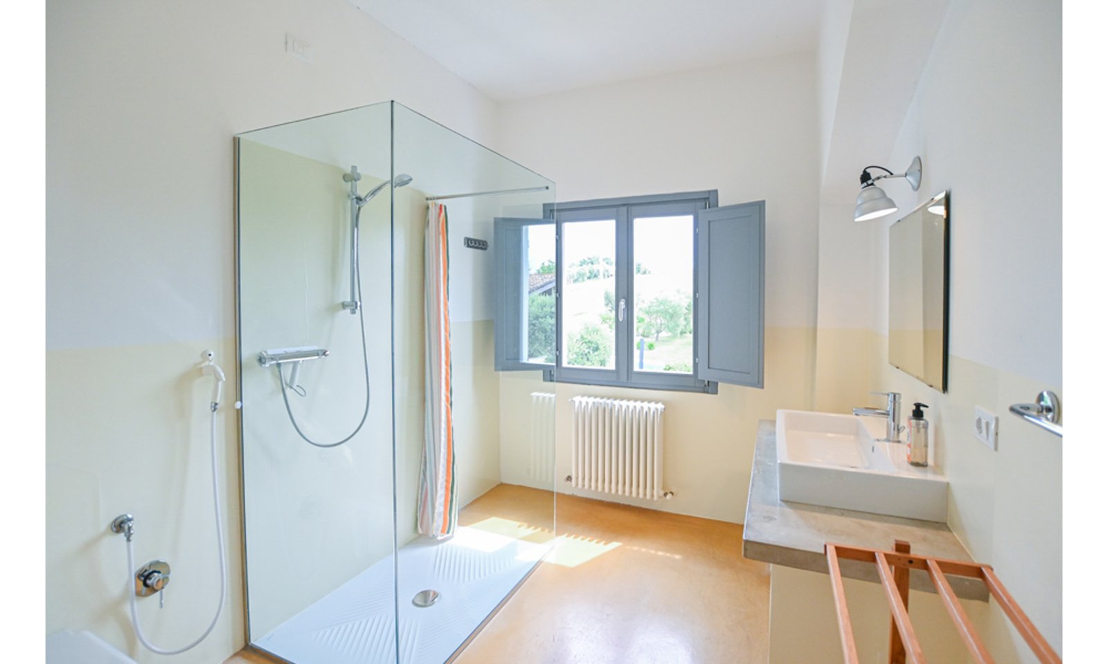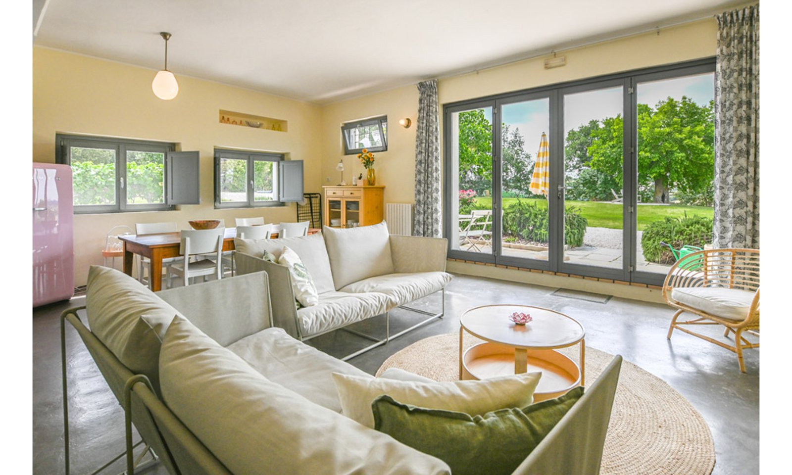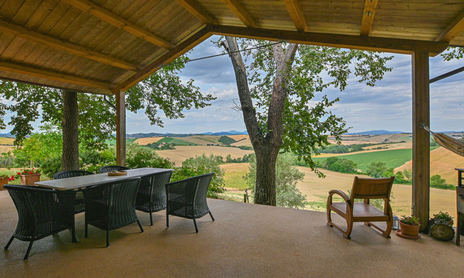 From every corner — whether lounging by the pool, sitting under the portico, or strolling through the garden — you can enjoy open views of the Marche countryside in all its seasonal beauty.