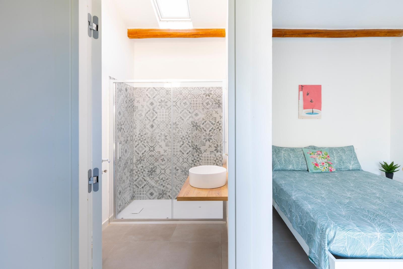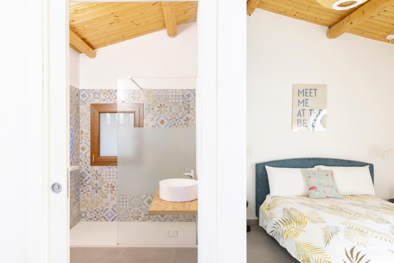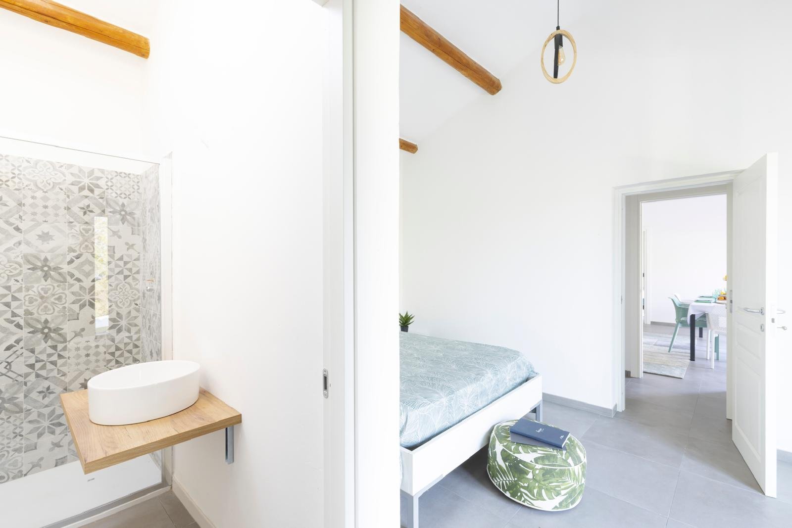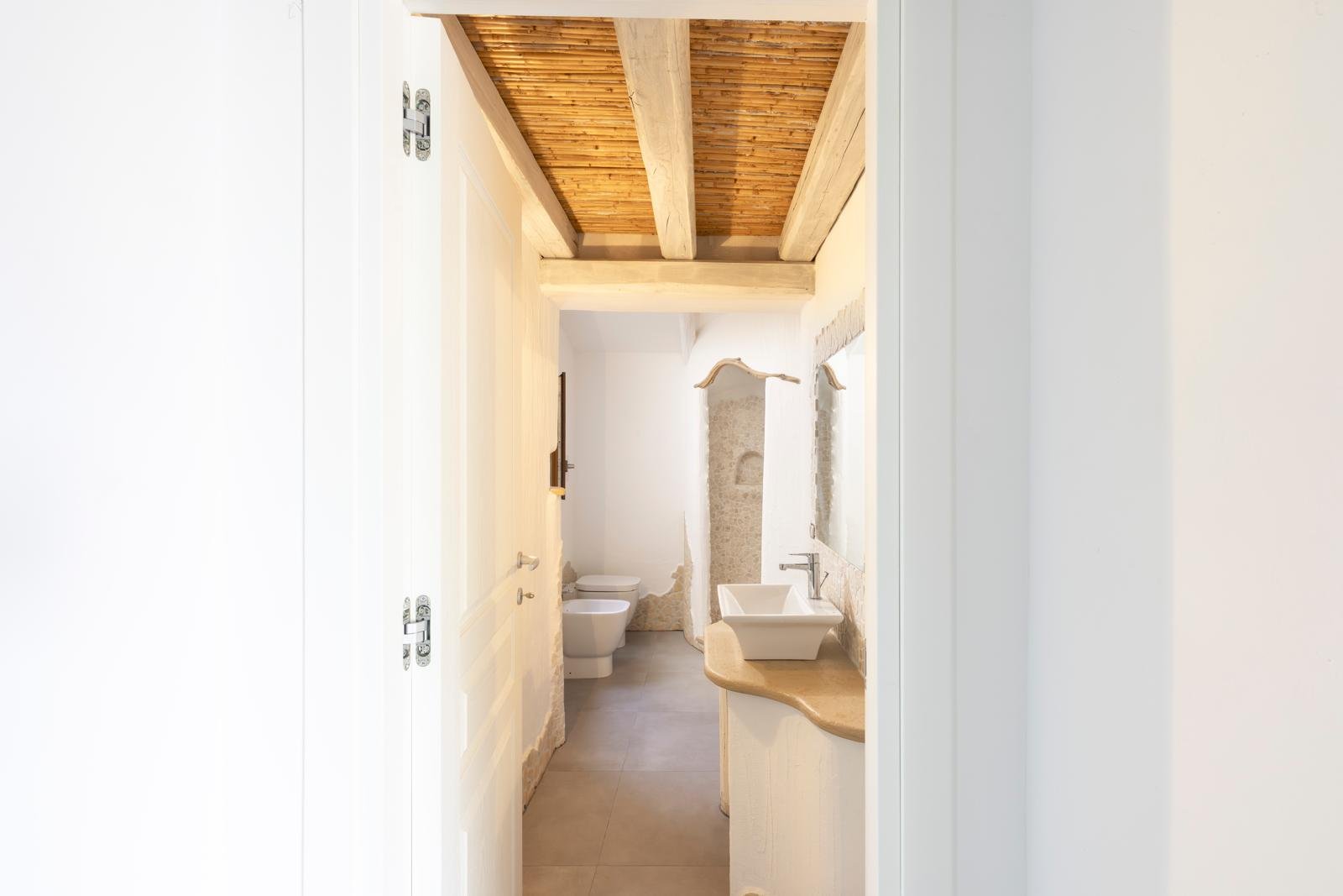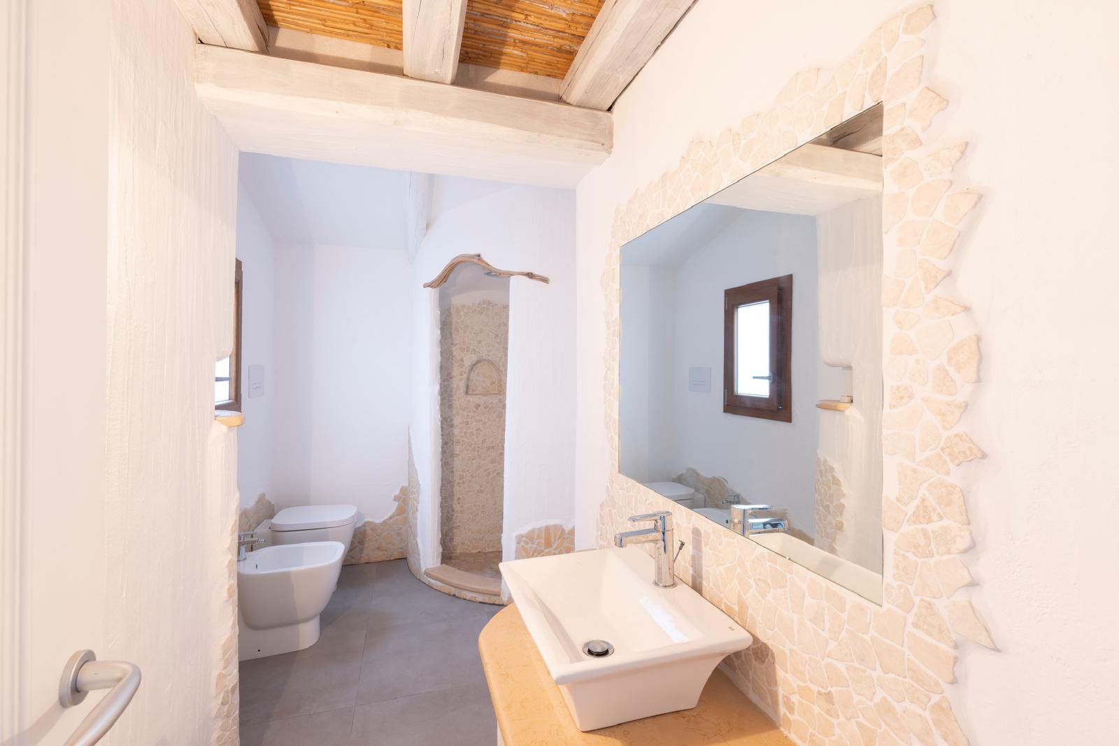 A guest bathroom finished with traditional Orosei marble chips pays homage to local craftsmanship and Sardinian heritage.